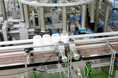 工場の中でも、特にチリひとつ入れない気密性が求められるこのエリア。自動ボトリング(製品を自動でビン詰め※主に錠剤やカプセル)する充填室は、工場の中心ともいえる設備で、完全な密閉を保っています。